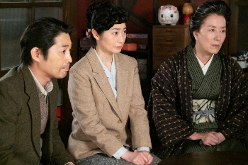 連続テレビ小説「なつぞら」第74話。息子の雪次郎を心配して上京した(右から)雪之助(安田顕)妙子(仙道敦子)とよ(高畑淳子)(C)NHK