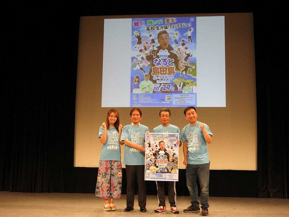 「第3回島田島はーふまらそん」をPRする(左から)福本愛菜、泉理彦・鳴門市長、間寛平、月亭八光