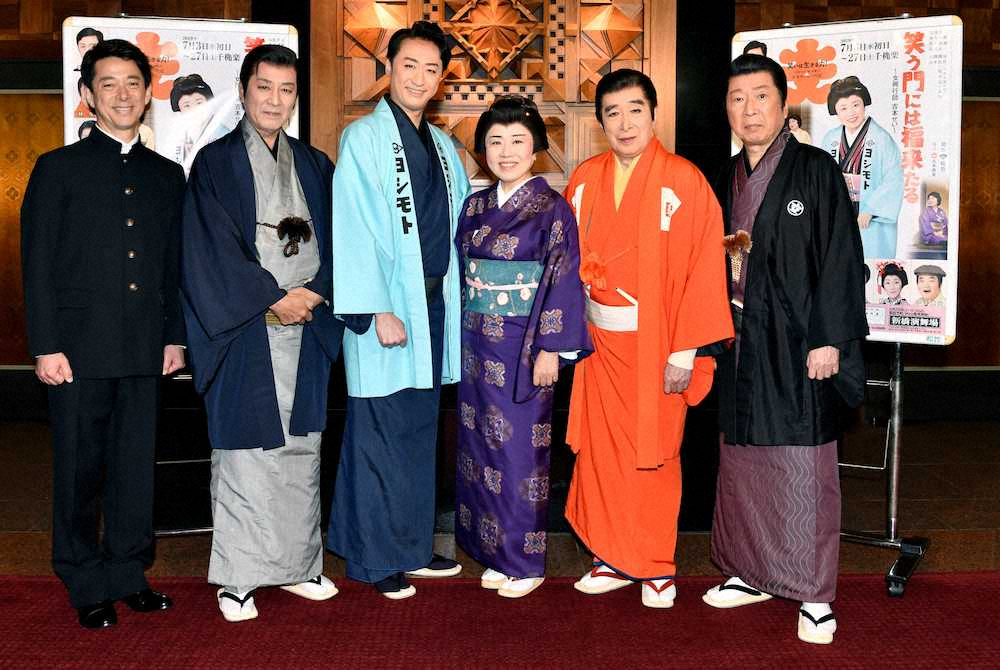 舞台「笑う門には福来たる」の舞台稽古に出席した(左から)西川忠志、田村亮、喜多村緑郎、藤山直美、林与一、石倉三郎