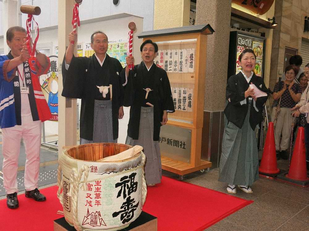 神戸新開地・喜楽館の1周年記念セレモニーで鏡開きする(左から)高四代喜楽館館長、笑福亭仁智、桂米団治、桂あやめ