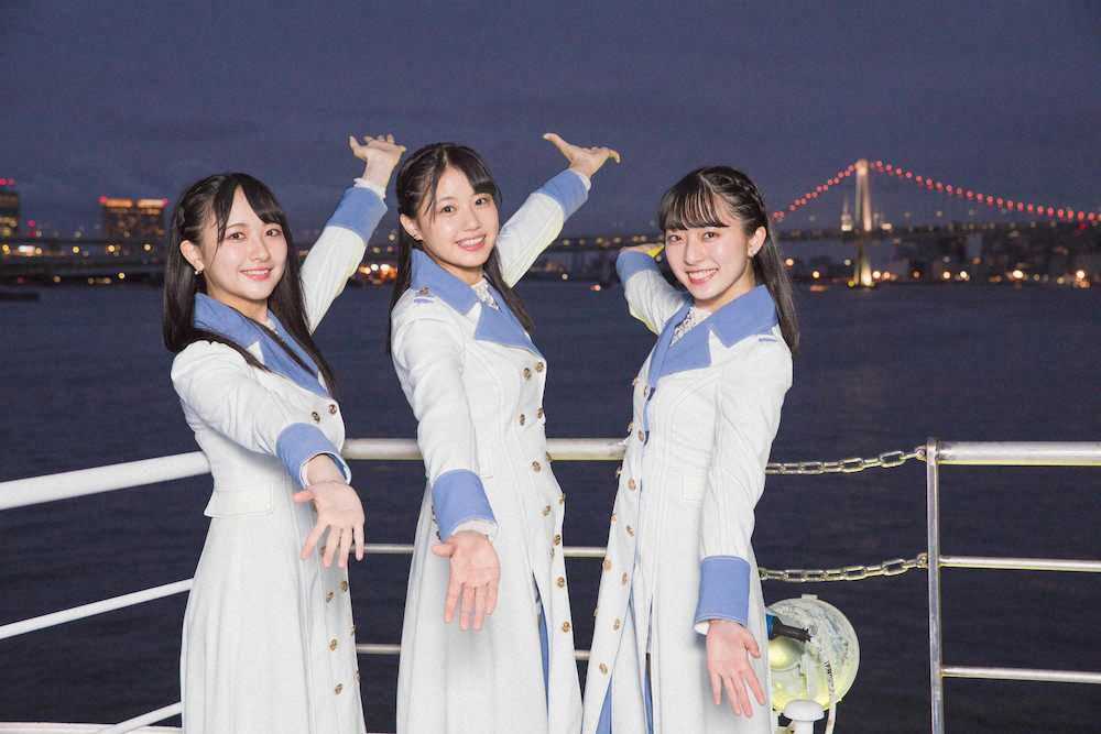 レインボーブリッジを背にする(左から)STU48石田千穂、瀧野由美子、今村美月