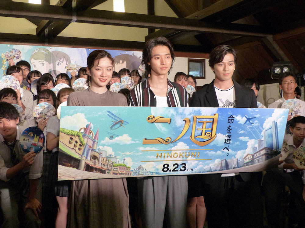 現実(一ノ国)と、隣り合わせの「二ノ国」の両世界を行き来する高校生の物語。山崎はトップクラスの秀才で車イスの主人公ユウ役。親友のハル役は新田真剣佑(22)が務め、その彼女のコトナと「二ノ国」にある王国のアーシャ姫の2役を永野芽郁(19)が演じた。