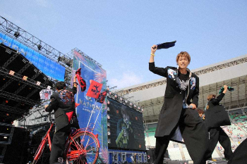 それに先立つ自分たちのステージでも、自転車で駆け回るなど、若さ全開のパワフルさで「帆をあげろ!」など5曲を披露した。