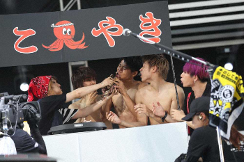 2曲目「抱きしめてシュヴァルツ」の最中に、ボイメンの辻本達規(28)勇翔(26)平松賢人(24)の3人が、樽美酒研二(38)とお揃いの際どいTバックをはいて、上半身は裸姿でいきなり登場。一緒にお尻ふりふりダンスを踊り、タコの丸焼きにかじりつくなど、ゴールデンボンバー顔負けのノリノリパフォーマンスで会場をドッと盛り上げた。