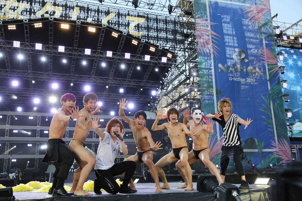 男性10人組エンターテインメント集団「BOYS AND MEN」(ボイメン)が18日、大阪・ヤンマースタジアム長居で開催された音楽フェス「a―nation」2日目の男性4人組エアバンド「ゴールデンボンバー」のステージに、Tバック姿で突然“乱入”した。
