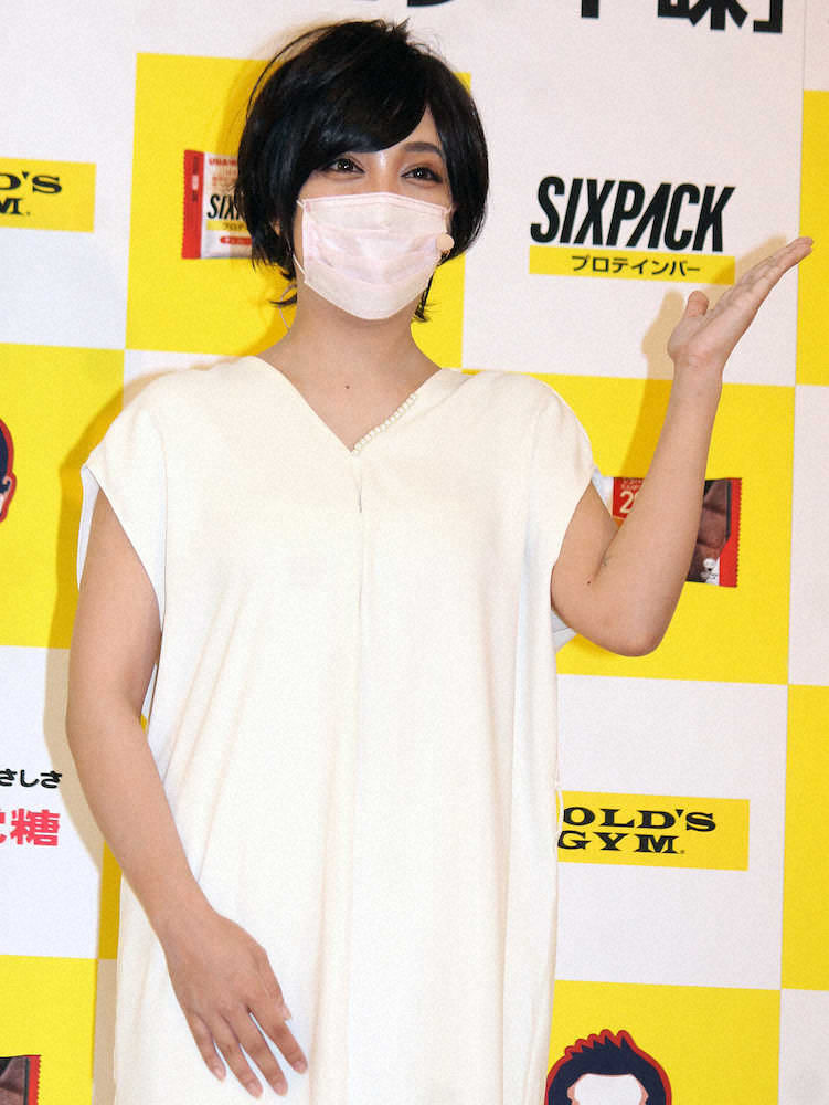 「SIXPACKプロテインバー」の発売記念イベントに滝川クリステルのメークで出席し、「お・も・て・な・し」を披露するざわちん