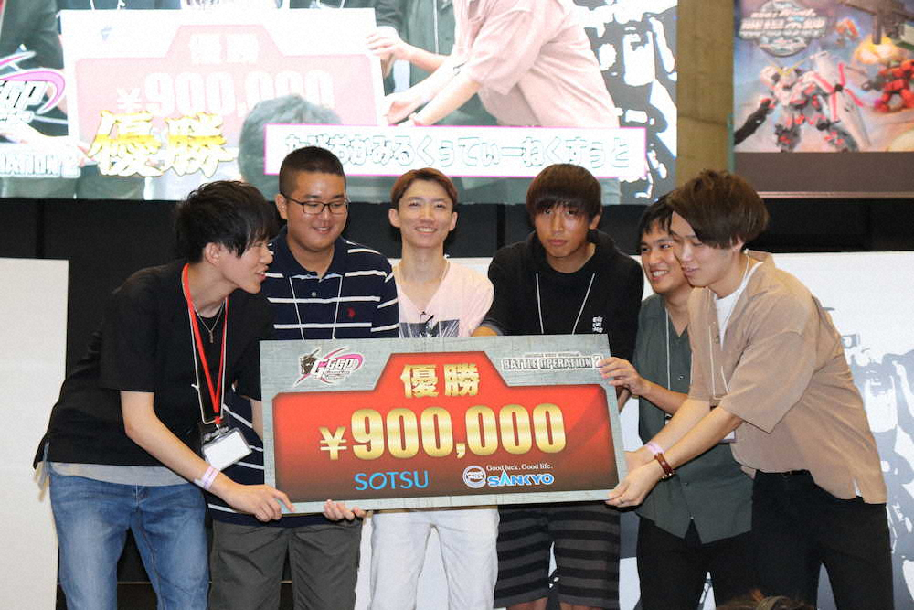 大会には全国からプレーヤーが集結し、この日はPS4「機動戦士ガンダム バトルオペレーション2」を対象に14チームによる激闘の末、チームメンバーの連帯感を発揮した「たぴおかみるくぅてぃーねくすぅと」が見事王者に輝いた。優勝賞金90万円をゲットしたリーダーのまつこうは「打ち合わせ通りの戦いができた。うれしい」と声を弾ませた。