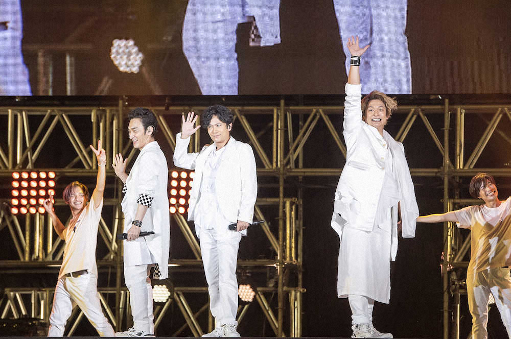 すっかり日が落ちたステージに白いジャケット姿の3人が登場すると、観客のボルテージは一気に高まった。「こんなに男性がいる前で歌うのは久しぶり」(草なぎ)「フェスの楽しさを知らなくて損していたんだな」(香取)など、初めての経験に興奮しながら「雨上がりのステップ」など6曲を披露した。
