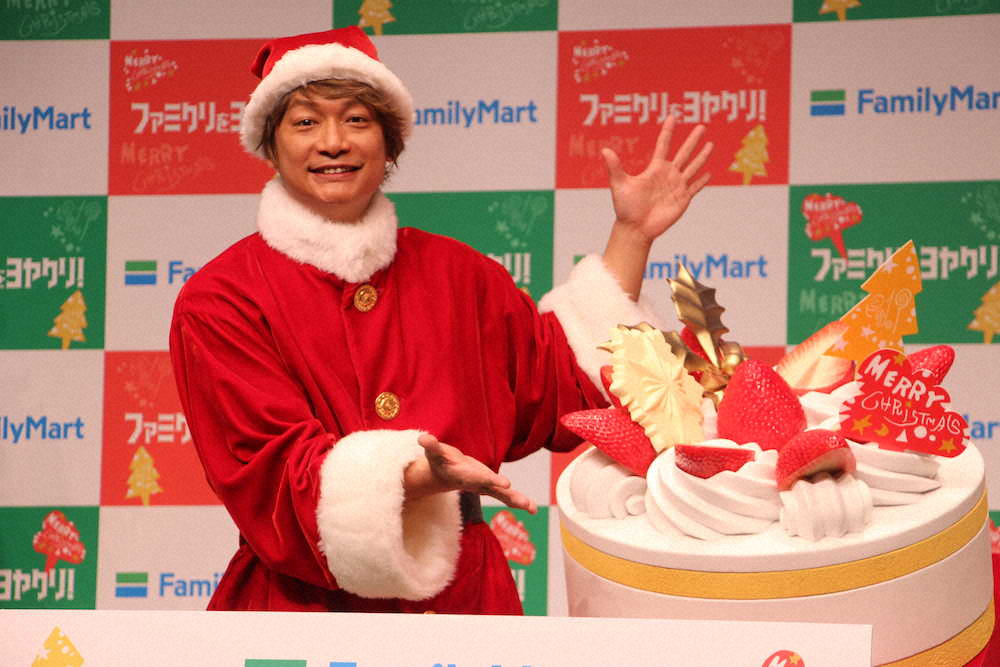 タレントの香取慎吾(42)が17日、都内で行われたファミリーマートのクリスマスイベント「ファミクリをヨヤクリ!」にサンタクロース姿で登場。自身が企画開発したクリスマスケーキを試食し、「皆に喜んでもらえるよう工夫を凝らした。ぜひ予約を」とPRした。