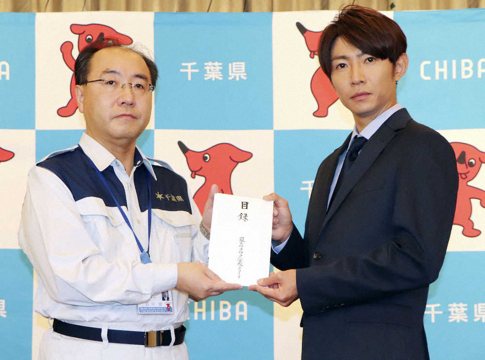 嵐の相葉雅紀(36)が24日、千葉県庁を訪問し、グループを代表して台風15号で大きな被害を受けた同県への義援金6000万円の目録を贈呈した。