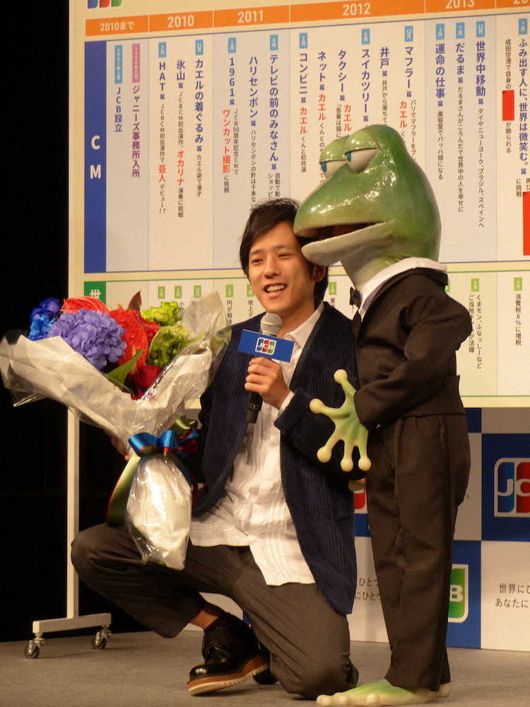 12年のCMで共演した「カエルくん」も登場。7年ぶりに再会して花束を受けた。