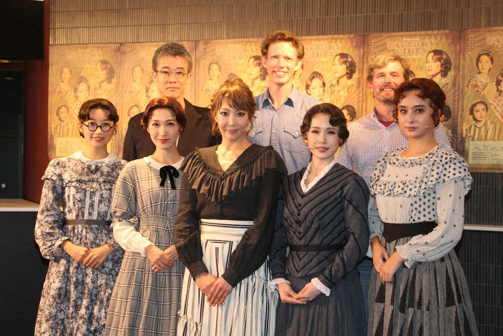 世界初演×日米共作ミュージカル「FACTORY GIRLS~私が描く物語~」初日を迎え、会見を行った出演者。(前列左から)清水くるみ、実咲凛音、柚希礼音、ソニン、石田ニコル(撮影・信永 真知子)