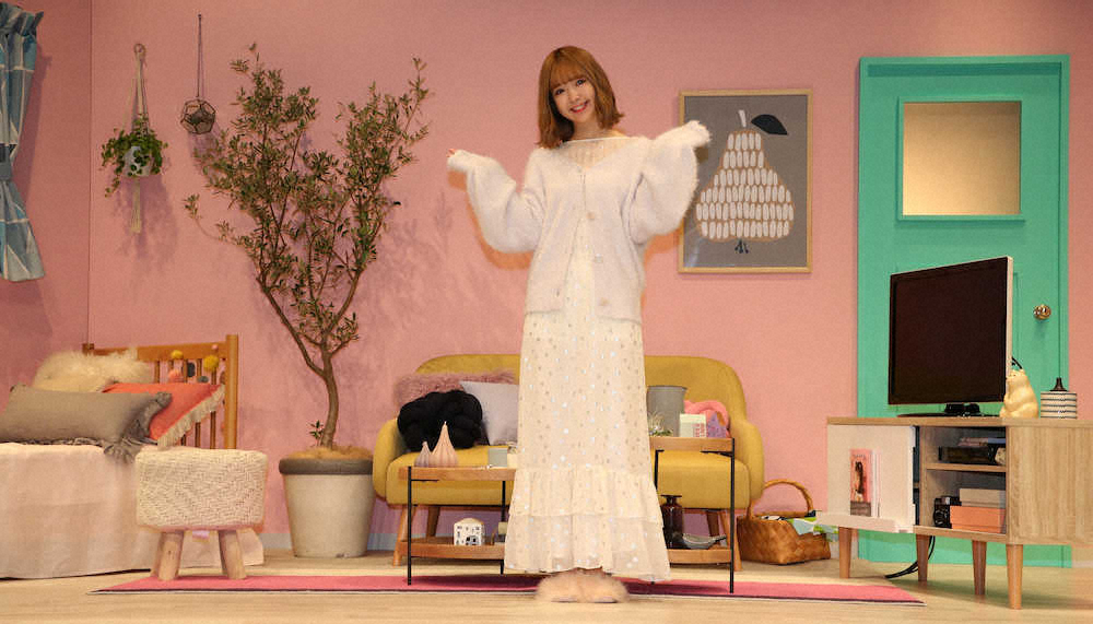同社のイメージキャラクターに就任した“にこるん”こと藤田はルームウエア姿で登壇。自身が選んだインテリアを集めたピンクの壁の“理想の部屋”が披露されると「めちゃくちゃ可愛い」とうっとり。「北欧風がテーマ。自分の部屋より派手めです」と説明した。