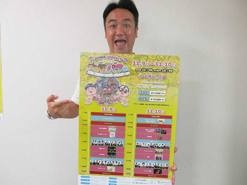 今年初開催の「大阪パフェ」は音楽、お笑い、スポーツ、グルメ、子供という5つのテーマをコラボさせた2日間のイベント。音楽では「スキマスイッチ」やファンキー加藤(40)、「ET―KING」「ベリーグッドマン」「純烈」「NMB48」「yaiko(矢井田瞳)×takataka」「大阪☆春夏秋冬」「たこやきレインボー」「東京ゲゲゲイ」という豪華メンバーが集結。「ET―KING」と「純烈」の異色コラボも実現する。一大音楽イベントとしても注目。そのトリを、今回はファンキー加藤が務めるが、たむらは「万博の野外(ライブ)のトリを浜田さんに締めてもらえれば最高じゃないですか」と先輩芸人のゲスト出演を狙う。浜田、小室哲哉(60)の「WOW WAR TONIGHT~時には起こせよムーヴメント」は213・5万枚をセールス。「いつかはでなく、今年でも」とたむら。「音楽担当の方正さんなら、サプライズで実現させてくれませんかね?」と月亭方正(51)にプレッシャーもかけた。7年前に兵庫・淡路島で開催した「TKF大祭り」では、大御所の明石家さんま(64)がエンディングに登場して爆笑トークを繰り広げ、「笑顔のまんま」を熱唱。「すごく盛り上がりました」とたむらは懐かしんだ。