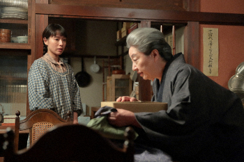 連続テレビ小説「スカーレット」第20話。喜美子(戸田恵梨香・右)から預かっていた信楽焼のカケラを渡す平田昭三(辻本茂雄・左)(C)NHK