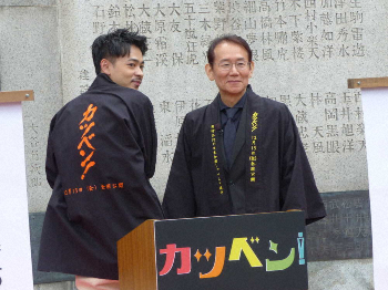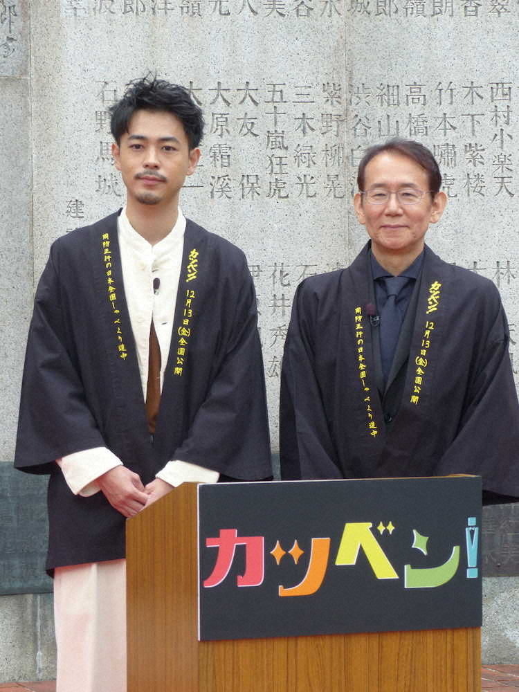周防正行監督(62)の最新映画「カツベン!」(12月13日)の「大ヒット出陣式」が24日、東京・浅草寺の映画弁士塚で行われた。周防監督と主演の成田凌(25)が出席した。