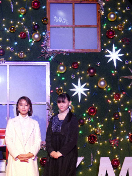 点灯させたクリスマスツリーをバックに笑顔の鈴木亜美(左)と浅川梨奈