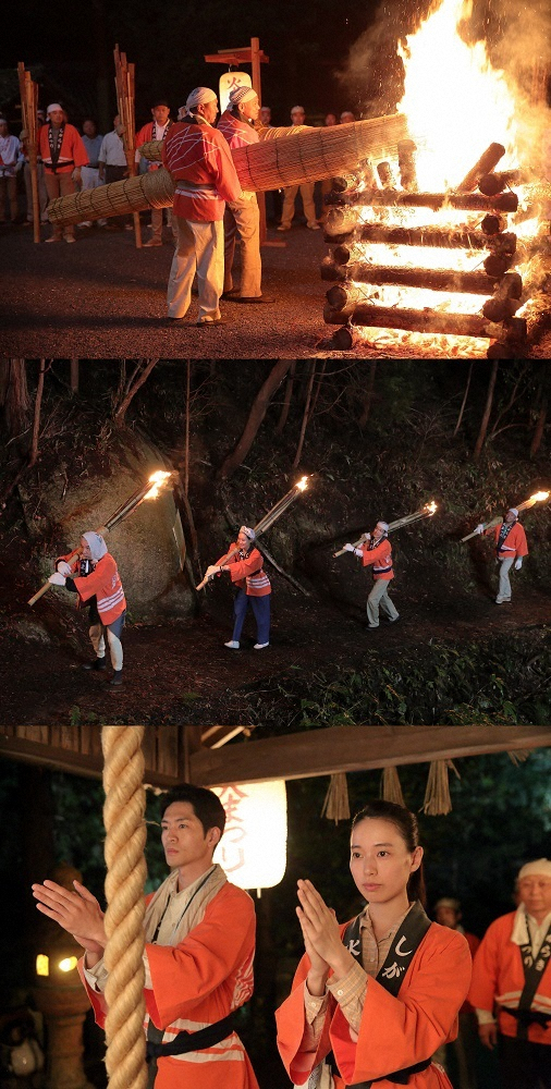 戸田と松下は撮影当日、雨に降られながらも約5キロのたいまつを担いで山道を歩き、奉納する「火まつり」ロケを終了。たいまつを担ぐ戸田の姿を目にした松下は「ものすごく頼もしかったです」。戸田が「背中がですか?」と笑って聞けば、松下は「そうです。その背中を追い掛けて僕も登りました」と振り返った。