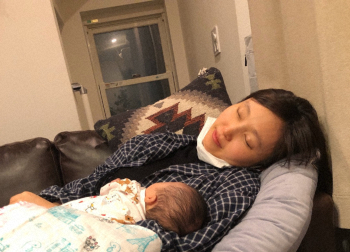 「おはようございます」のタイトルでアップしたブログで「この前気絶したように寝落ちしてしまった私を夫に激写されました」とコメントし、愛娘を抱いて目を閉じ幸せそうに眠っている写真をアップした。
