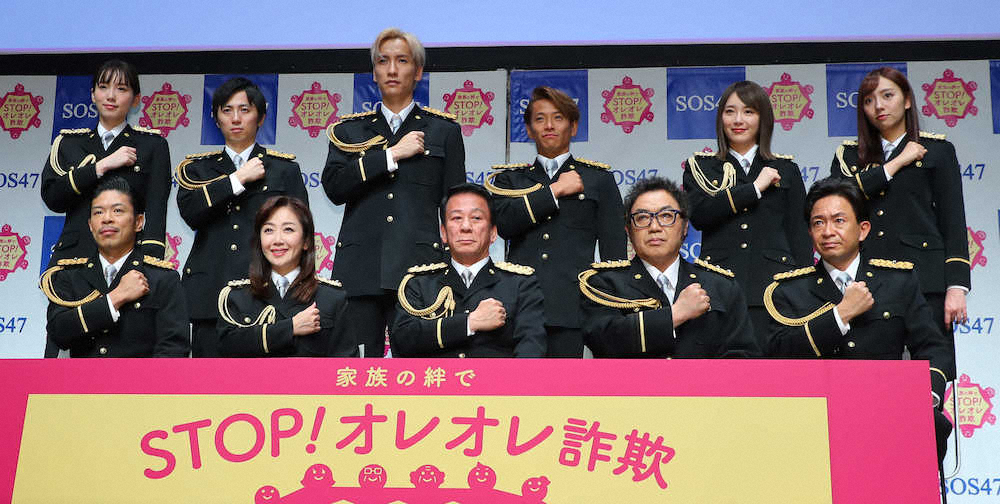 俳優の杉良太郎(75)、男性ユニット「w―inds.」、女優の飯豊まりえ(21)が3日、都内で「ストップ・オレオレ詐欺47~家族の絆作戦~」プロジェクトチームの決起集会を開いた。