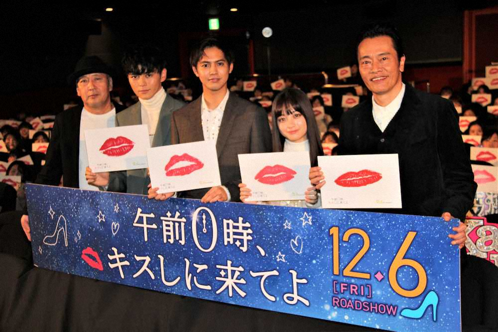 映画「午前0時、キスしに来てよ」の先行上映舞台あいさつに出席した(左から)新城毅彦監督、眞栄田郷敦、片寄涼太、橋本環奈、遠藤憲一
