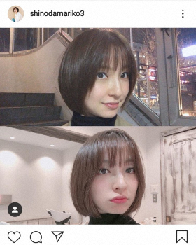 その後、篠田は連続投稿で髪を切る前の姿とショートカットになった写真を掲載。「before after」と題して「いろんな髪型挑戦してみよっと」とつづった。またハッシュタグでは「#髪の毛乾くの早いです」「#丸顔髪型」「#日に日に丸顔」とも添えられていた。