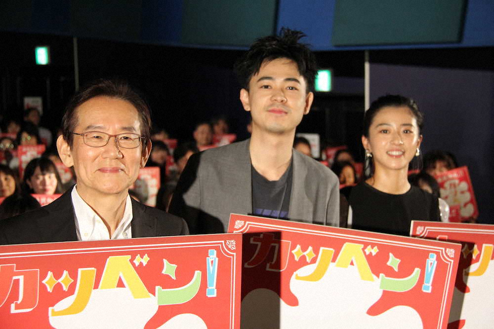 映画「カツベン!」のお客さま御礼舞台あいさつに出席した(左から)周防正行監督、成田凌、黒島結菜