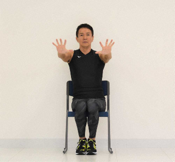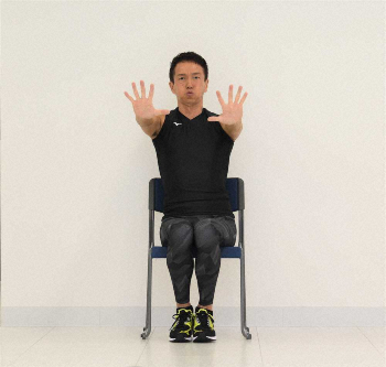(2)頬を膨らませ口から7秒間強く吐きながら、手を前に伸ばして、手を思い切りパーに開きます。これを10回行います