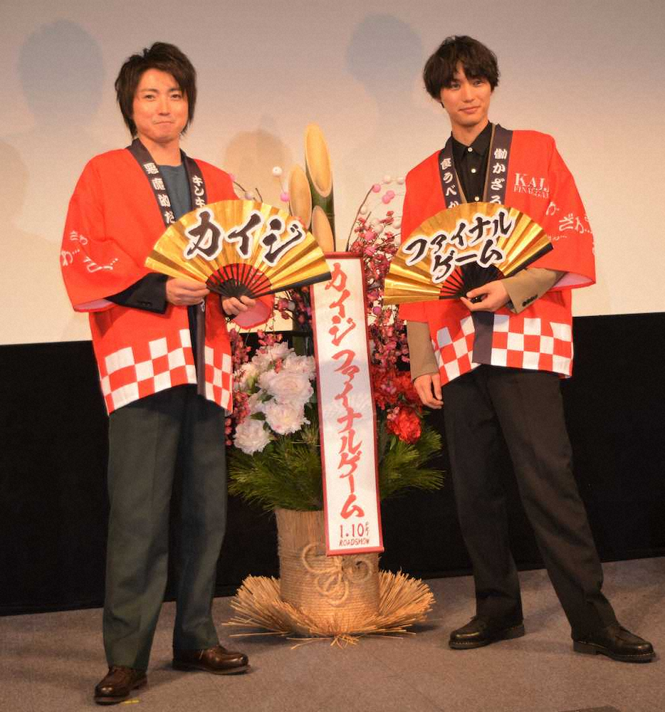 俳優の藤原竜也(37)と福士蒼汰(26)が7日、都内で行われた映画「カイジ ファイナルゲーム」(監督佐藤東弥)の特別試写会に登場し、舞台あいさつを行った。