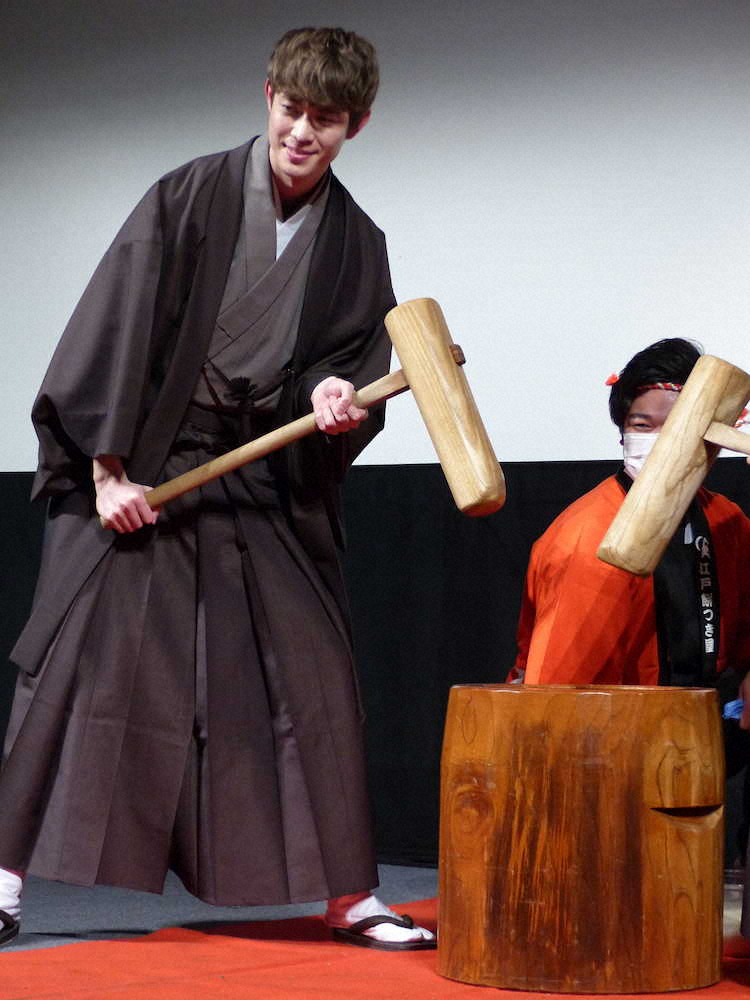 正月らしく羽織はかまで「人生初か2回目」という餅つきも披露。「(きねが)意外と重いんだね」と笑うと黄色い歓声が湧いた。作品ではゲイを隠し生きる男性を熱演。「インターナショナルスクールの男子校で育ち、普通に友達にもいたが、卒業すると(同性愛に)甘い社会ではないと感じる。ずっと何かの助けになりたかったので光栄」と話した。