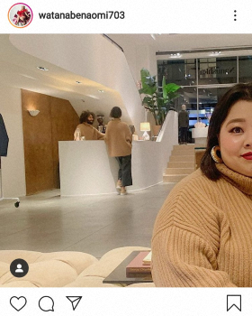 「NYのお気に入りのお洋服屋さんに入ったらみんな同じニット着てた」と書き込んで投稿。ブラウンのニットを着た店員と思われる2人をバックに、同様のニットに身を包みながら渡辺が店内のソファに座る写真を掲載した。