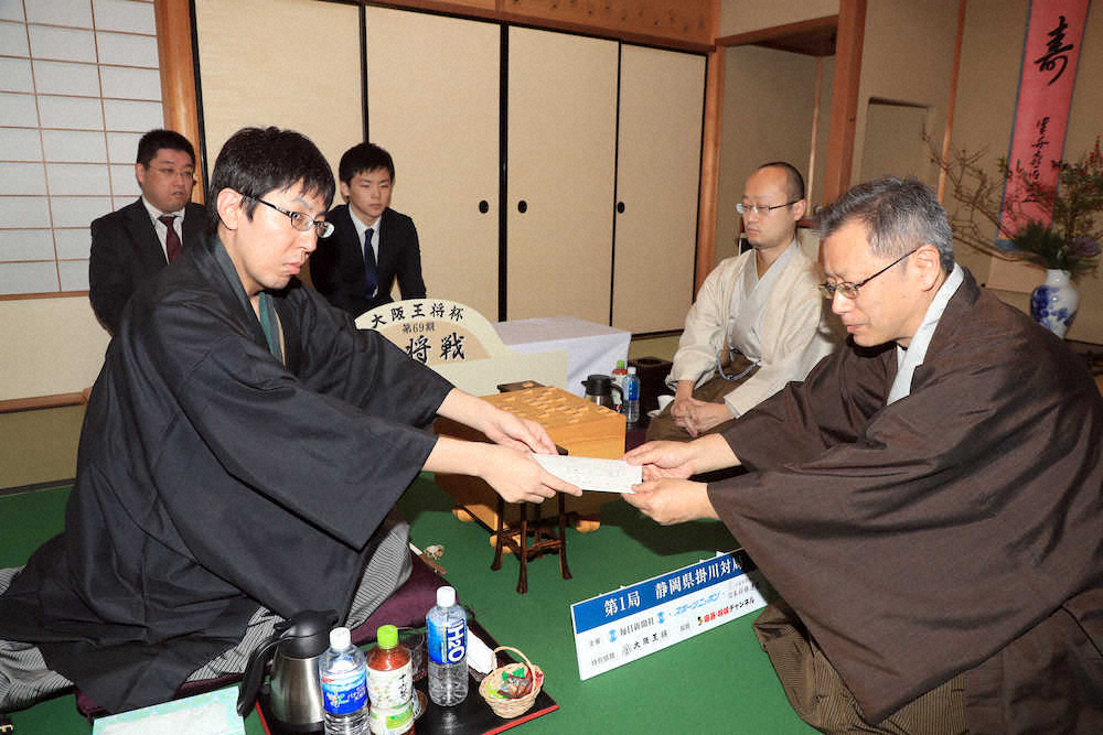 防衛を目指す渡辺明王将(35)=棋王、棋聖との3冠=に奪取を狙う広瀬章人八段(32)が挑む将棋の第69期大阪王将杯王将戦(スポーツニッポン新聞社、毎日新聞社主催)7番勝負第1局が12日、静岡県掛川市の「掛川城二の丸茶室」で始まり、後手の広瀬が56手目を封じて1日目が終了した。
