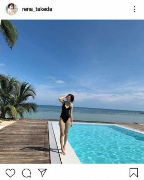 武田はハッシュタグで「#thailand」と添えて投稿。タイと思われる場所で青空の下、プ―ルサイドを歩く写真を掲載。ワンピース仕様となっているブラックの水着姿で美脚を披露した。
