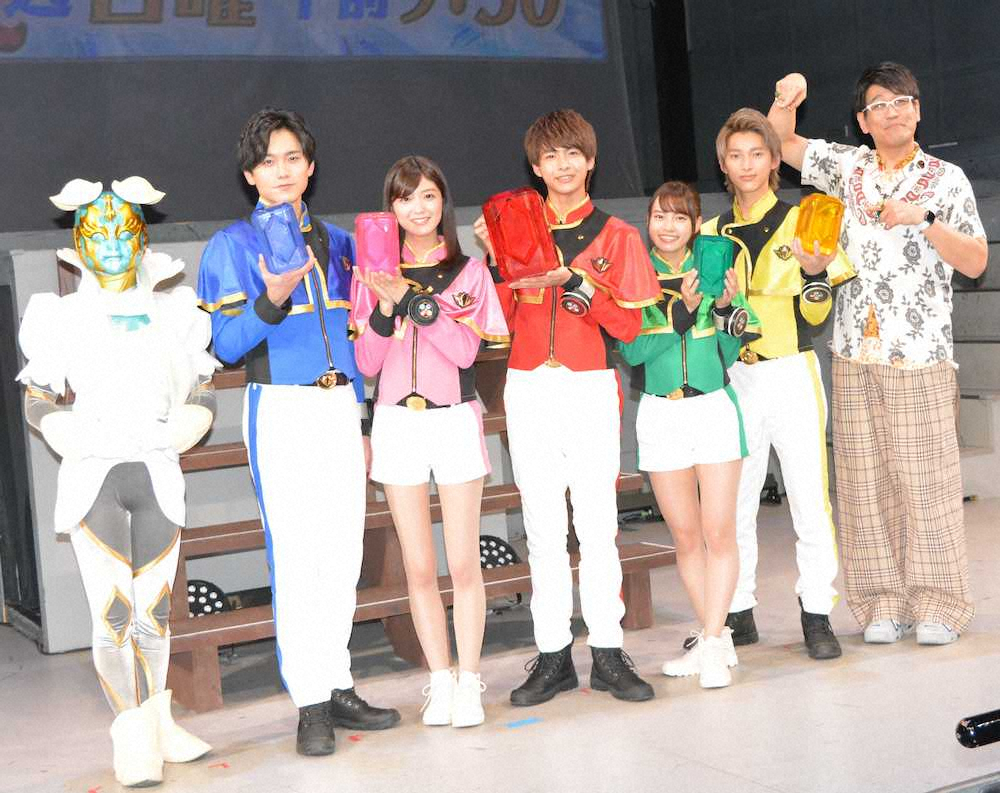 会見には、キラメイレッド/熱田充瑠役の小宮璃央(17)、キラメイイエロー/射水為朝役の木原瑠生(21)、キラメイグリーン/速見瀬奈役の新條由芽(21)、キラメイブルー/押切時雨役の水石亜飛夢(24)、キラメイピンク/大治小夜役の工藤美桜(20)が出席した。