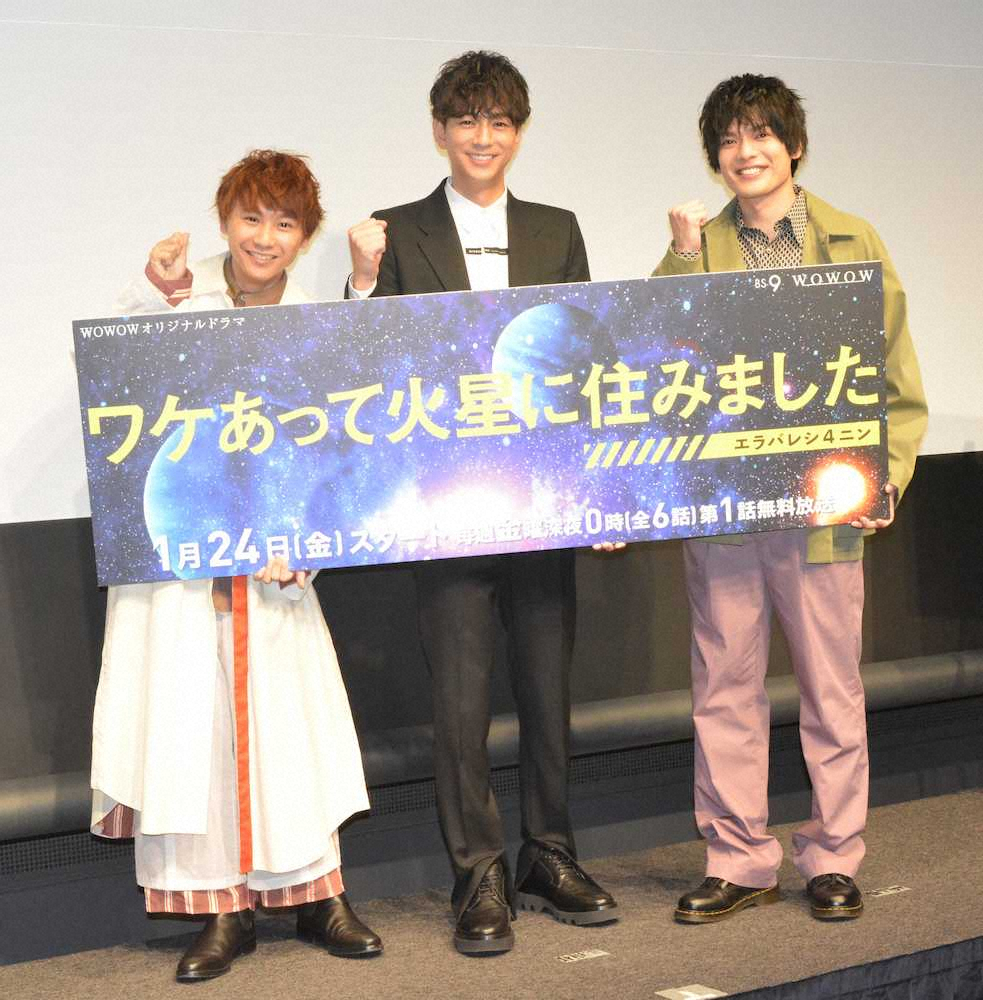 俳優の三浦翔平(31)、崎山つばさ(30)、須賀健太(25)が17日、都内でWOWOWオリジナルドラマ「ワケあって火星に住みました~エラバレシ4ニン~」(WOWOWプライム、24日深夜0時スタート、全6話)の放送を記念したトークイベントに登壇した。