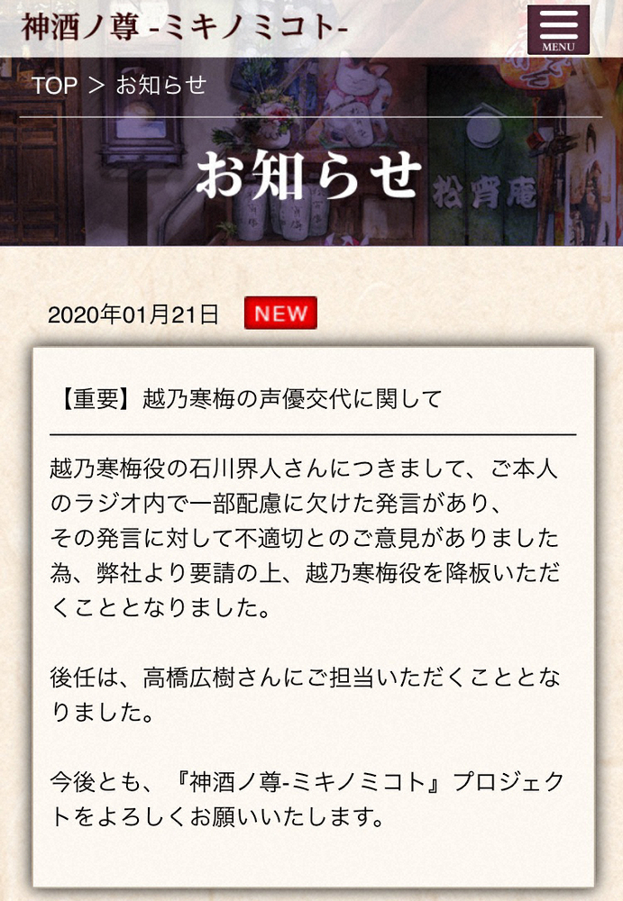 声優の石川界人 Photo by スポニチ 声優・石川界人がラジオで“不適切発言”日本酒の擬人化プロジェクト「神酒… ギャラリーで見る この記事のフォト 2020年01月21日の画像一覧 もっと見る 2020年01月21日の画像をもっと見る