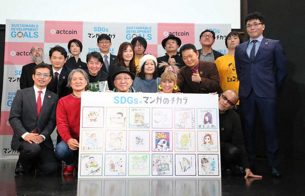 この日、都内で開かれた新プロジェクト「SDGs×マンガのチカラ」制作発表会見には、「惨劇館」の御茶漬海苔氏、「味いちもんめ」の倉田よしみ氏、「Dr.コトー診療所」の山田貴敏氏、「怨み屋本舗」の栗原正尚氏、「CAとお呼びっ!」の花津ハナヨ氏、「マイコン刑事」の下條よしあき氏、「西日暮里ブルース」のピョコタン氏、「まいっちんぐマチ子先生」のえびはら武司氏、「OLヴィジュアル系」のかなつ久美氏、「つるピカハゲ丸くん」ののむらしんぼ氏、「少年アシベ」の森下裕美氏、「ブラックエンジェルズ」の平松伸二氏、「長谷部さんのいる野球部」の上野祥吾氏、「パギャル!」の浜田ブリトニー氏と世代を超えて親しまれている漫画家がそろい踏み。仕事などの都合で欠席した「GTO」の藤沢とおる氏、「エリア88」の新谷かおる氏、「キャンディ・キャンディ」のいがらしゆみこ氏、「課長島耕作」の弘兼憲史氏の4人もそれぞれコメントを寄せた。