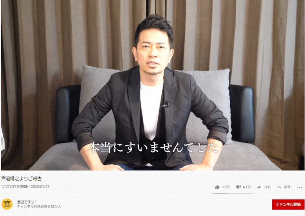 特殊詐欺グループとの間で闇営業を行い、芸能活動を休止していた「雨上がり決死隊」宮迫博之(49)が29日、公式YouTubeチャンネルを開設し、騒動を謝罪する動画を公開した。神妙な表情を浮かべ「相方の横に戻りたい」と、蛍原徹(52)との活動を熱望。「一から頑張ります。チャンスをください」と訴えた。30日から、動画公開を本格化し、活動を再開させる。