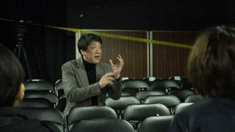 MBSテレビ「OFLIFE」で舞台の本番前に役者たちを鼓舞する嶋尾康史(中央)