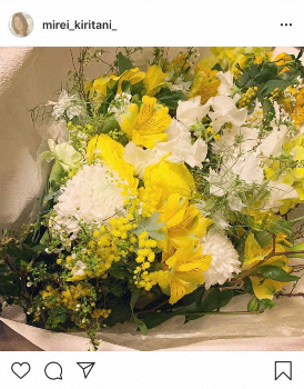 桐谷は「みなさま、温かいコメント、本当にありがとう」と祝福に感謝。「今日の撮影終わりに花束もいただいて、感謝感激」と黄色の花束の写真を添えた。この投稿に、なおも祝福の声が溢れている。