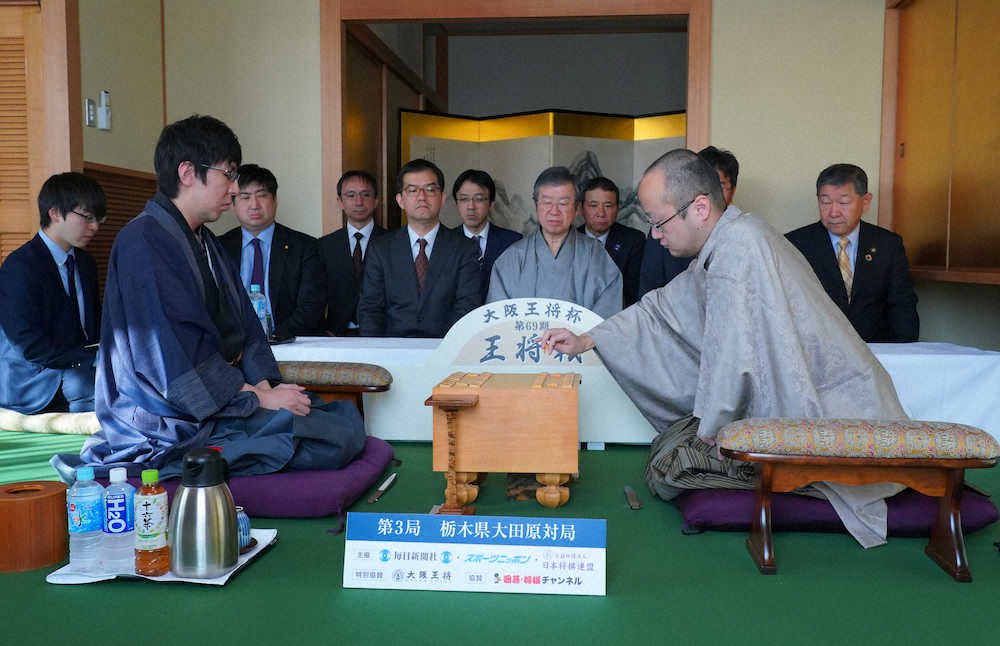 将棋の第69期大阪王将杯王将戦(スポーツニッポン新聞社、毎日新聞社主催)7番勝負第3局第1日は8日午後1時30分に昼食休憩が終了し、対局を再開した。