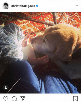 滝川は「優しい光景」というコメントともに、道之助くんの足と、愛犬・アリスちゃんが写る写真を投稿。ハッシュタグで「#アリス」「#元保護犬」「#育児」と添えた。
