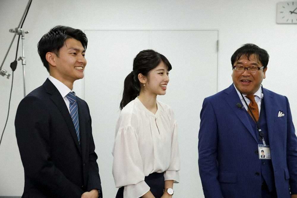 今春、関西テレビにアナウンサーとして入社する(左から)山本大貴さん、舘山聖奈さん。同局特番「カンテレアナウンサー真冬の挑戦SP~」でカンニング竹山(右端)と共演