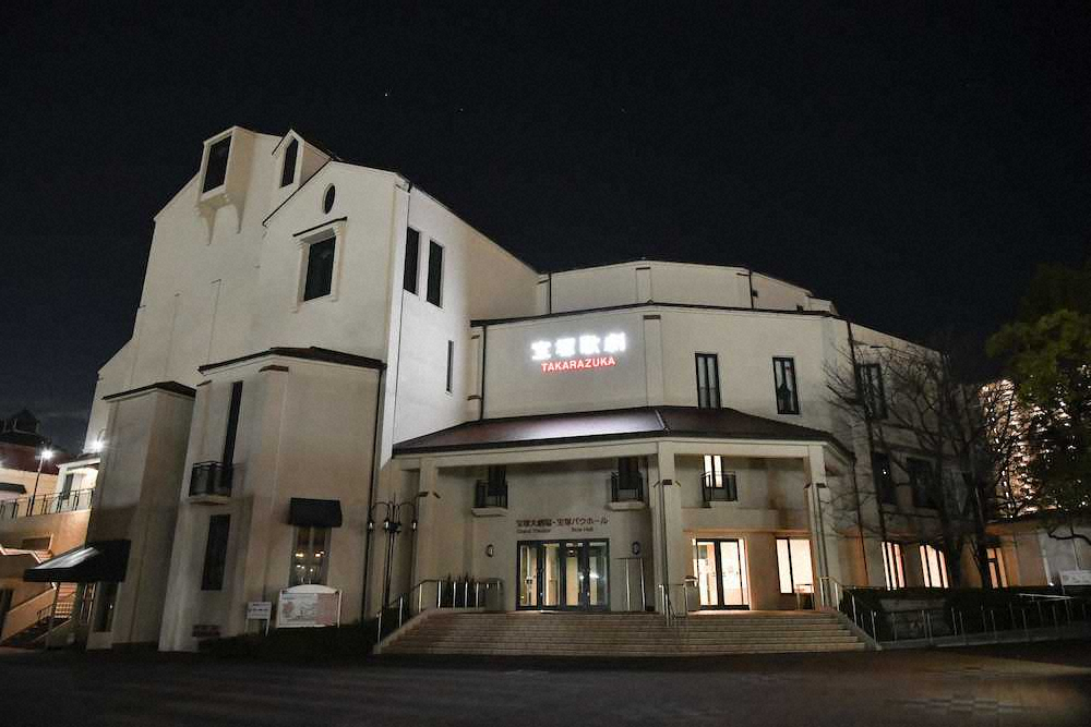 29日からの公演中止が決まった宝塚大劇場=27日夜、兵庫県宝塚市