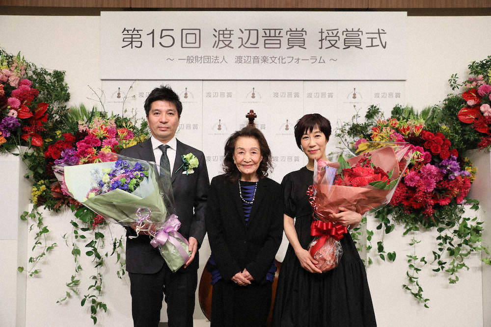 菅野氏は、昨年11月の「天皇陛下御即位をお祝いする国民祭典」で嵐が歌った奉祝曲「Ray of Water」を作曲。日本の音楽シーンに多大な影響を与えていることが評価された。渡辺音楽文化フォーラムの渡辺美佐理事長からトロフィーと副賞100万円を受け取り「ミュージシャンとしてアイドルのバックバンドや、ミュージカルのオケピット、ドラマの録音でピアノを弾いて、全て現場で先輩のやっていることを見て覚えました。今はもういないレジェンドの仕事ぶりを実際に体験したことなど、細胞が覚えている豊かな音が、自分を作っていると思います」と受賞の喜びを語った。