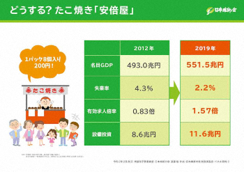 「安倍屋を建て直すには」と題し、たこのサイズの工夫を「行政サービスの効率化」と置き換えたり、一つ一つのたこ焼きをおいしくするためには「お金の使い方をもっと工夫する」などとして、ソースだけをかけたたこ焼きと、さらにマヨネーズをトッピングしたたこ焼きのイラストを添え、視覚的にも訴えた。