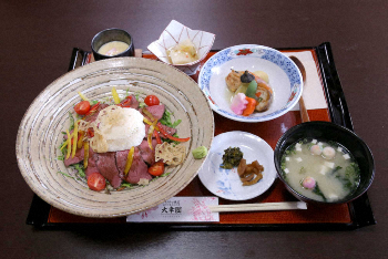 12:30 昼食休憩。自室に戻りローストビーフ丼定食。雲に見立てたような泡雪豆腐がのせられている