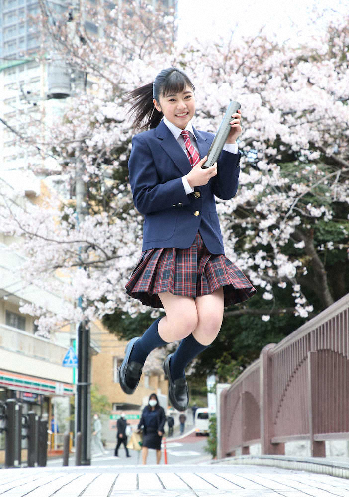 桜の前で中学卒業を報告する吉柳咲良(撮影・小海途 良幹)