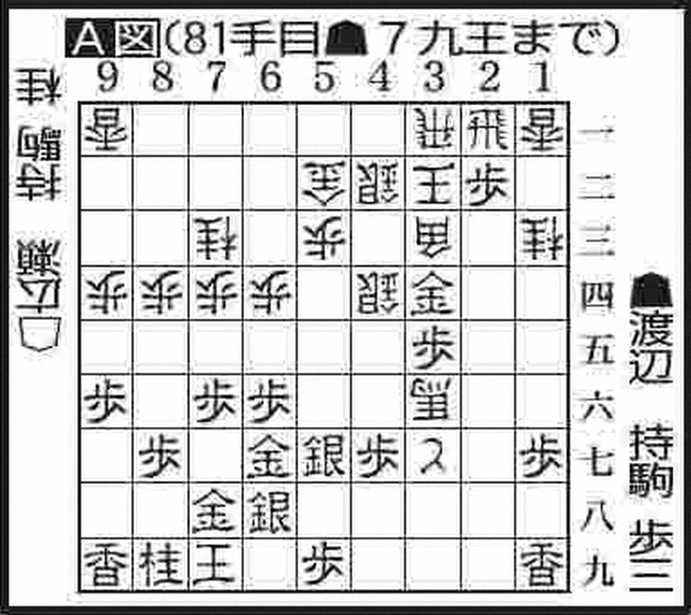 ▲2二歩~2三銀成と竜を取り返し、渡辺の駒に勢いが増す。渡辺がこのまま寄せ切るかと思われた中、▲5七銀右といったん緩め、△3六馬に▲7九王(A図)が冷静な判断だった。