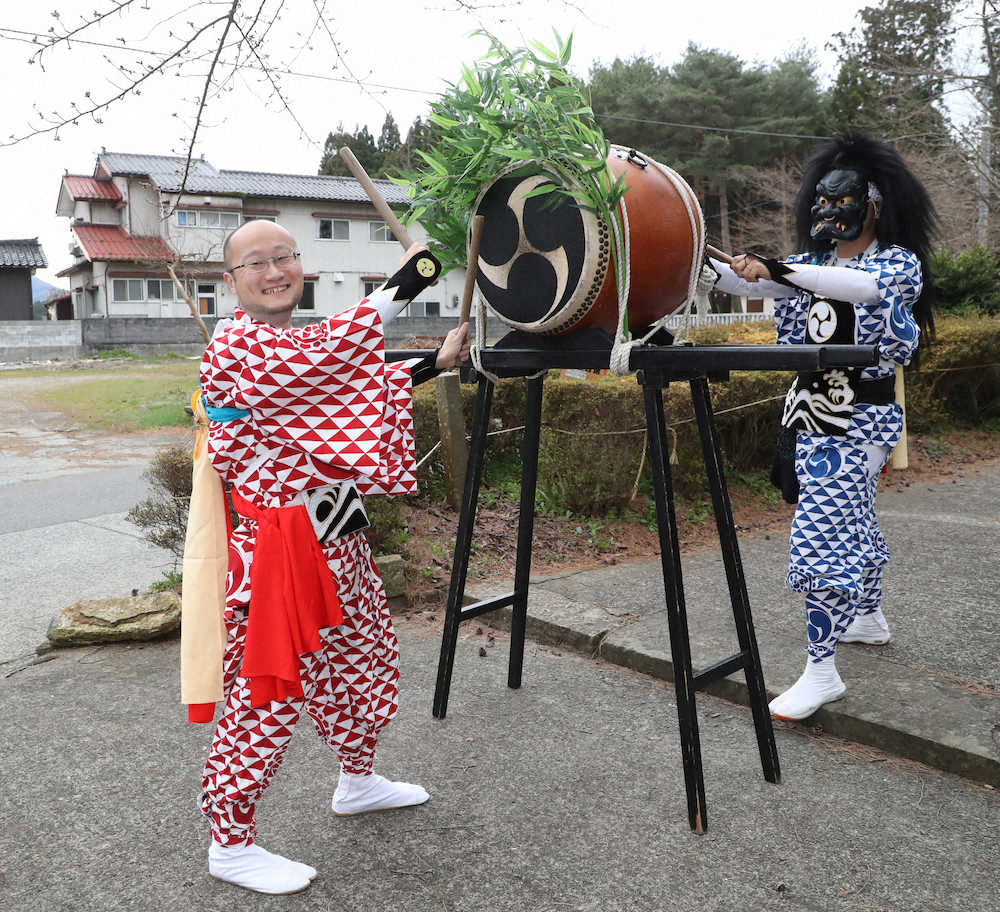 王将位を防衛した渡辺明王将(左)は 厄払いの神事である鬼太鼓を演じる(撮影・西川 祐介)
